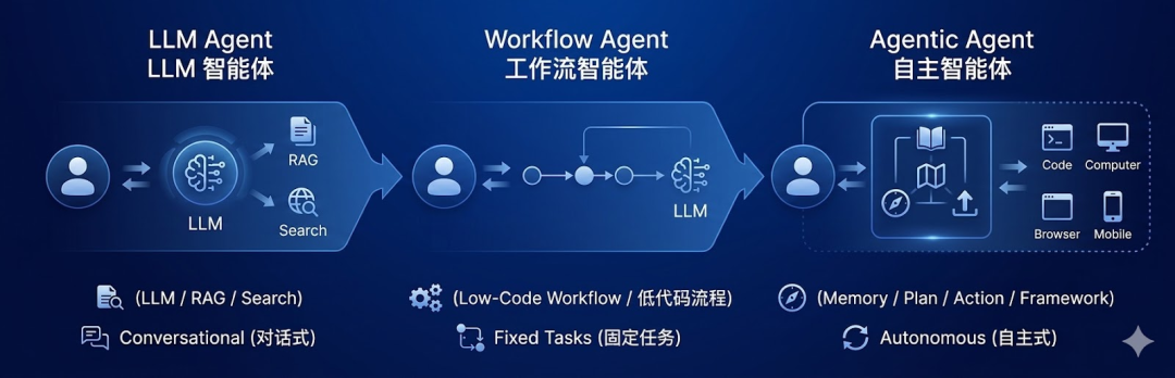 早期的 LLM Agent 主要依赖 Prompt、知识检索和简单工具调用,本质仍然是对话助手;随后出现的 Workflow Agent 引入了流程编排和任务自动化,模型可以根据预设流程完成复杂操作;而在最新一代 Agentic Agent 架构中,智能体可以自主规划任务、动态调用工具并持续与环境交互。