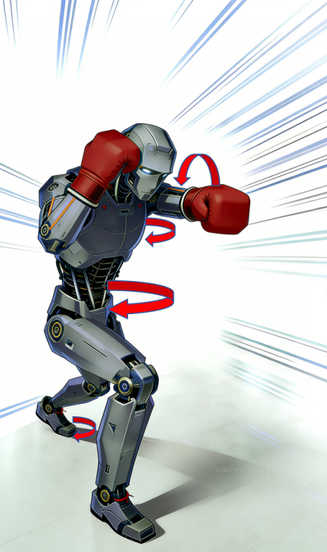 除了在运动和击打过程中需要控制好机器人的姿态、保持平衡外,一些高难度的腾空动作也是将来的发展方向。目前人形机器人搏击赛中尚未出现腾空跳跃等动作,但从《武BOT》所展示的技术可见,这在工程上已经可以实现。机器人完成起跳、腾空动作与稳定落地的整套流程,需精准模仿人类跳跃的力学逻辑:起跳阶段,通过下肢蹬伸发力配合上肢摆动加速,形成预设起跳角度与初速度;腾空阶段,借助上肢摆动与躯干扭转改变转动惯量,以控制空中旋转等姿态;落地阶段,通过屈膝、翻滚等柔顺控制方式,延长触地时间,有效缓冲冲击力。