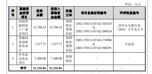 根据此前披露的招股书,奥图股份本次公开发行股票计划募集资金约2.13亿元,扣除发行费用后,将全部投入三大核心项目,分别为高端智能制造工厂建设项目、智能制造创新研发项目以及补充流动资金项目。