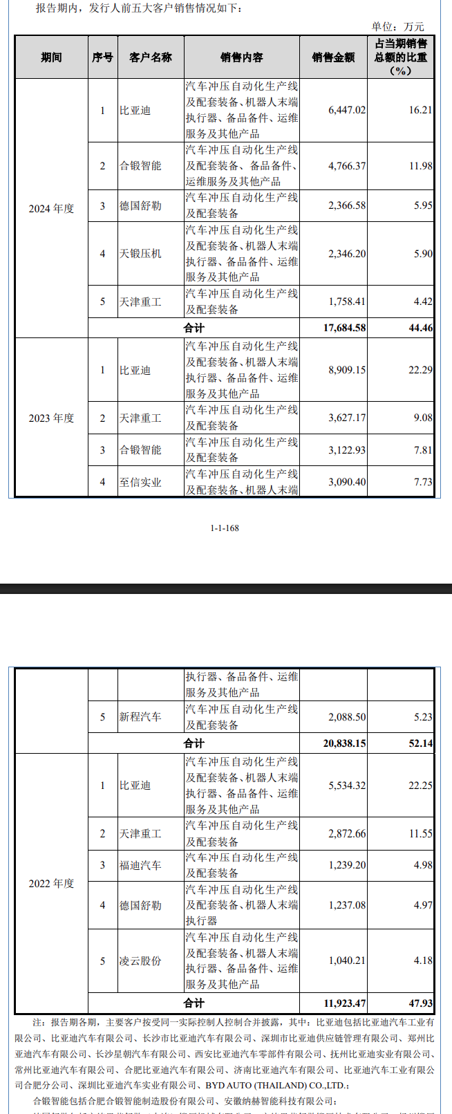 客户集中度方面,2022年至2024年,奥图股份前五大客户销售占营业收入的比重分别为47.93%、52.14%及44.46%,整体呈现先升后降的趋势。其中,比亚迪作为这三年来第一大客户,各期销售收入分别为5534.32万元、8909.15万元和6447.02万元,占营业收入的比例分别为22.25%、22.29%和16.21%。