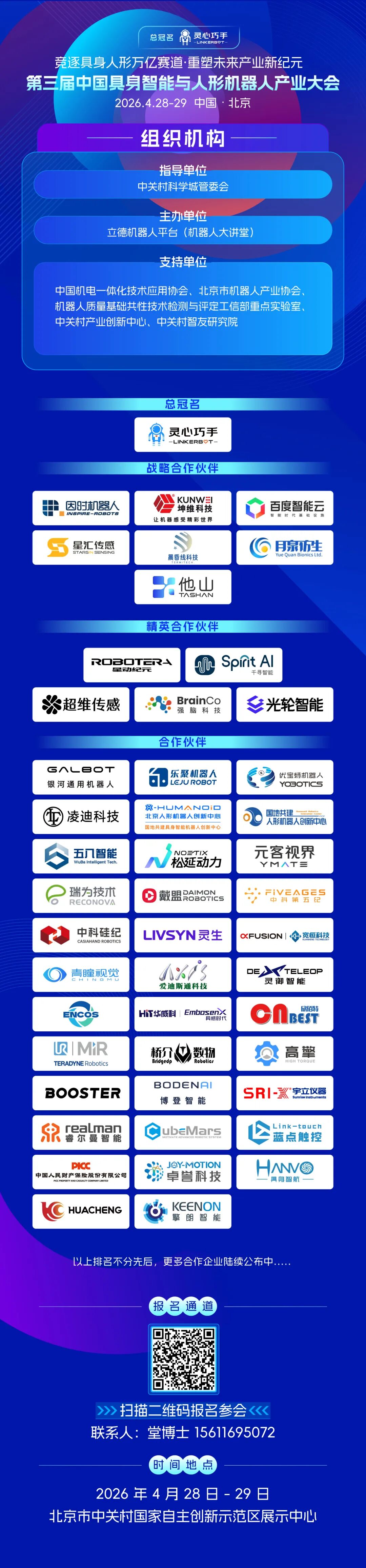 点击链接,查看大会详情:顶配阵容!院士学者与产业领袖4月齐聚北京,第三届中国具身智能与人形机器人产业大会邀你共赴万亿赛道
