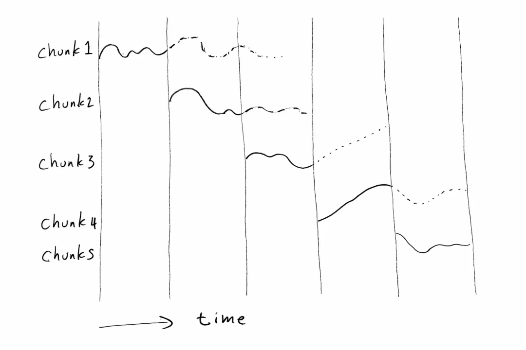 机器人的某个关节先沿着第一段轨迹(Chunk 1)运动,当到达第二段轨迹(Chunk 2)出现的时刻(图中的竖线位置)时,便切换为沿第二段轨迹继续运动;随后再在第三段轨迹(Chunk 3)出现时进行切换,如此循环。来源:https://generalrobots.substack.com/p/robotera-snatches-silver-in-sock