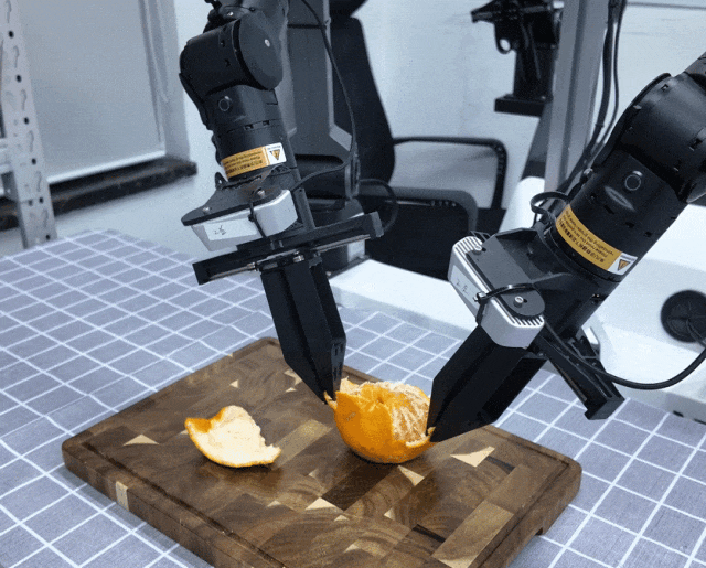 更困难的是,这一过程往往需要双机械臂的协同配合:一只机械手需要稳定固定橘子,控制整体受力,另一只手则需要沿着果皮边缘进行精细剥离。在剥离过程中,力的大小、方向以及接触位置都需要不断动态调整,一旦两只手之间的配合出现偏差,就容易造成挤压或撕裂。