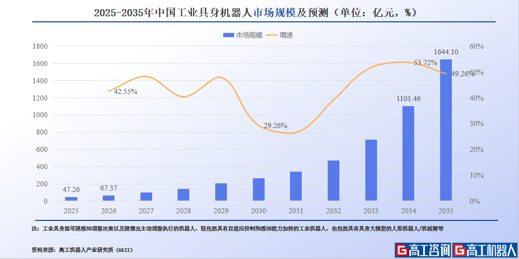 从行业数据来看,微亿智造所处的赛道正处于爆发前夜。通过高工机器人产业研究所(GGII)的走访调研和预测分析,2025年我国工业具身机器人市场规模约47.3亿元,预计十年内市场产值将突破千亿元规模,到2035年,中国工业具身机器人市场规模有望达到1644.1亿元,年复合增长率为42.3%。