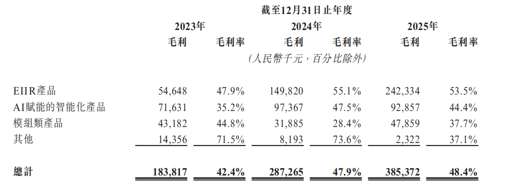 此外,EIIR收益占比从2023年的26.3%迅速攀升至2025年的57.0%。EIIR产品毛利率更是从47.9%攀升至53.5%,这背后是EIIR产品占比上升和规模效应释放的双重驱动。