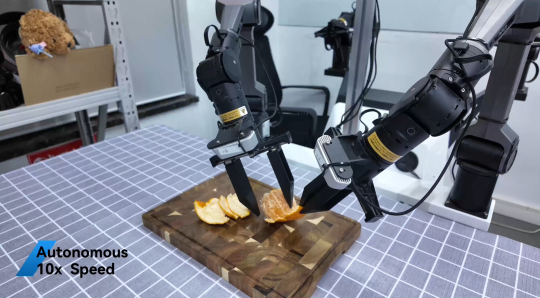 剥橘子听起来是人类日常,但技术难度在于,机器人需要精准区分果皮与果肉的细微视觉差异,实时跟踪剥制过程中果皮持续的形变轨迹,视觉感知需具备极高鲁棒性。放弃工具,意味着放弃了规避这一难度的捷径,选择了完全由模型能力来承载任务,这是一种主动提升挑战维度的选择。
