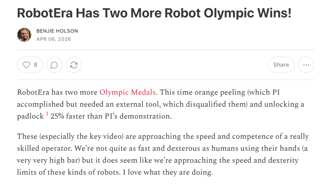 在全球具身灵巧操作难度顶尖的真机赛事——Benjie's Humanoid Olympic Games(以下简称Benjie's Olympics)中,一家中国公司竟然在剥橘子、开锁、翻袜子三项核心任务中,全面超越此前纪录保持者Physical Intelligence(简称PI),从而引发行业热议。