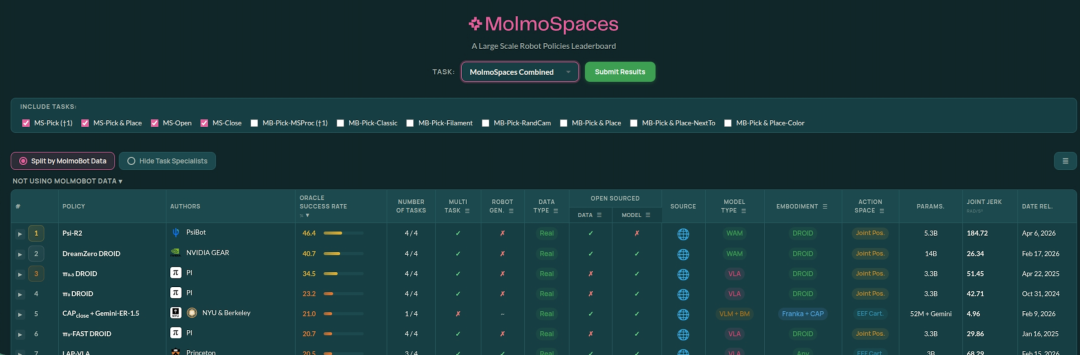 截至发稿,公开榜单页面显示,在 MolmoSpaces Combined 榜单、且不使用 MolmoBot Data 的分组中,Psi-R2 以 46.4 的 Oracle Success Rate 排名第一,并覆盖 4 个任务。