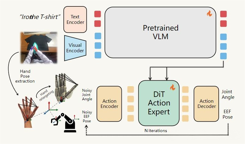 研究团队最终用了一个颇为曲折的方法破局:引入IMCopilot辅助系统,用强化学习训出底层精细操作技能兜底,让人只负责大范围的手臂运动,精细的指尖操作交给系统自动完成。这才把成功率从34%拉到了89%,勉强采集到了够用的数据。