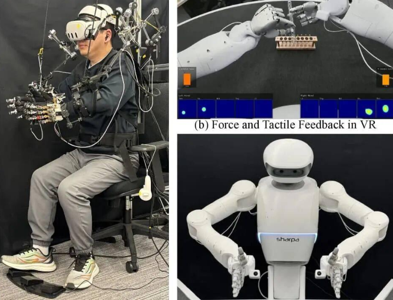 刚性外骨骼的技术思路方向是直接测关节角度。上海交大的研究已经给出了真实验证,用外骨骼加VR头显遥操作63自由度双臂,虽然能提升成功率,但因为机械结构束缚了自然动作,采集效率和约束较多,数据又严格绑定设备自身的机械尺寸,换台设备数据就失效了,不可能批量使用。