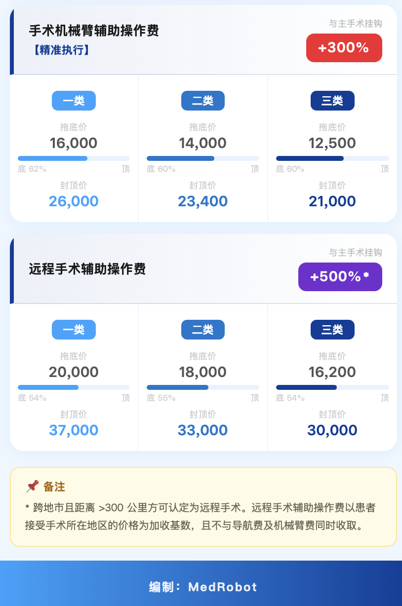 另设远程手术辅助操作费:基础定价一类20000元、二类18000元、三类16200元。以患者接受手术所在地价格为基数,按主手术价格的500%加收,封顶:一类37000元、二类33000元、三类30000元。文件明确界定"远程"为跨地市且距离超过300公里。