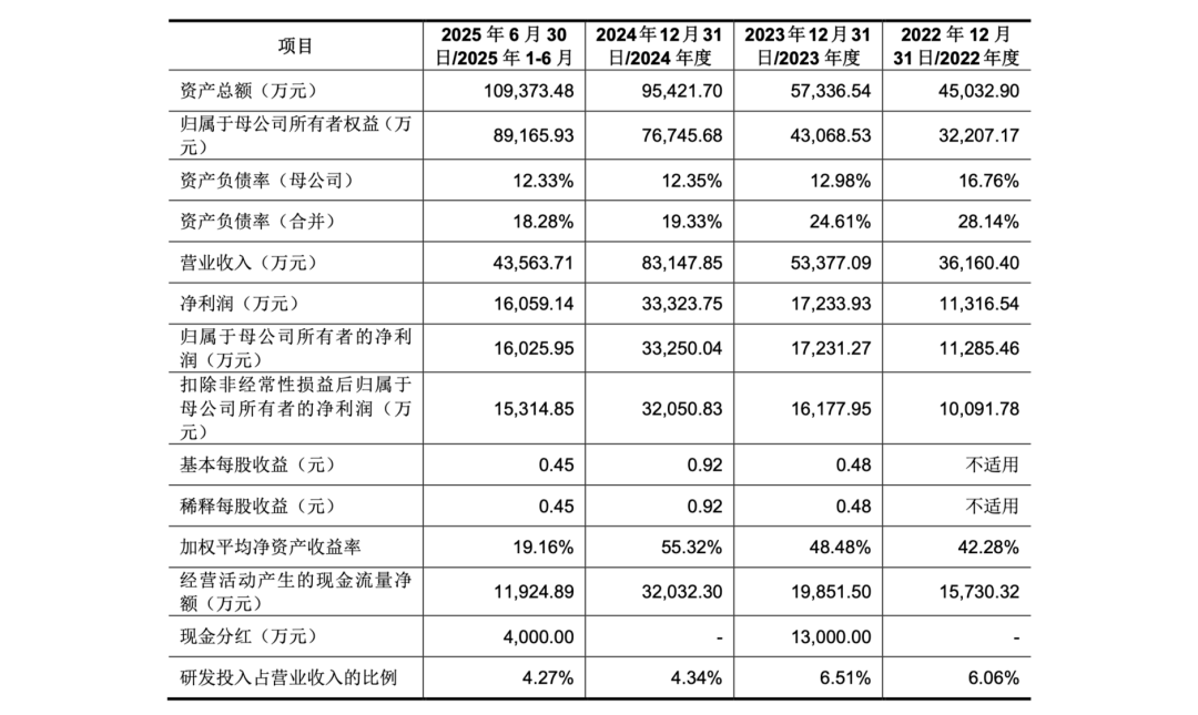 强劲的技术实力和清晰的发展战略,推动三瑞智能的业绩实现持续高速增长。招股书显示,2022-2024年及2025年上半年(简称:报告期),该公司营业收入分别约为3.62亿元、5.34亿元、8.31亿元、4.36亿元,最近三年营业收入复合增长率达51.64%;净利润分别约为1.13亿元、1.72亿元、3.33亿元、1.61亿元;扣非归母净利润分别约为1.01亿元、1.62亿元、3.21亿元、1.53亿元,盈利能力持续提升。