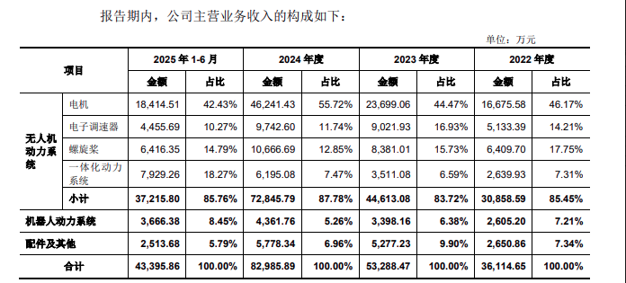 从业务结构来看,干公司收入主要来源于无人机动力系统、机器人动力系统等核心业务板块。报告期内,三瑞智能来自无人机电动动力系统的营收分别约为3.09亿元、4.46亿元、7.28亿元、3.72亿元,占总营收的比例分别为85.45%、83.72%、87.78%、85.76%,始终是公司的核心营收支柱,且2022-2024年复合增长率高达53.64%。细分来看,无人机动力系统内,电机产品贡献最大,2025年1-6月实现收入18414.51万元,占总营收的42.43%,虽较2024年度的55.72%有所下滑,但仍稳居第一。