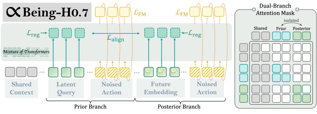 但这一「思考空间」本身并不天然具备对未来的建模能力。为此,Being-H0.7 采用了双分支设计:一条路径在「未来可见」的条件下(后验视角,posterior branch),引导模型学习哪些中间判断真正有助于动作决策;另一条路径在「不可见未来」的真实部署条件下(先验视角,prior branch),约束模型仅基于当前观测形成尽可能一致的判断。