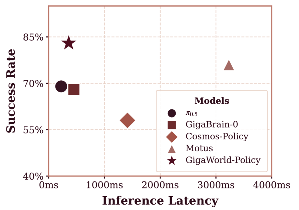 更关键的是,这种速度的提升直接转化为了控制性能的跃升。在真实世界的任务评测中,GigaWorld-Policy 的平均成功率达到了 83%,不仅比 Motus 快 9 倍,成功率更是高出 7 个百分点。