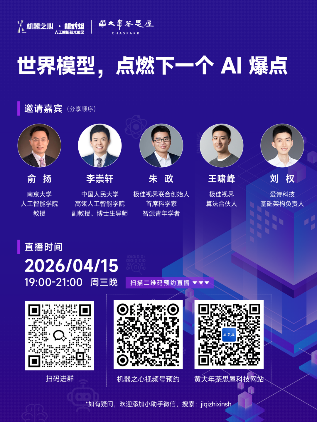 4 月 15 日 19:00-21:00,机器之心将联手黄大年茶思屋,邀请 5 位产学研顶尖专家,从技术突破到产业实践,深度解析世界模型的最前沿。