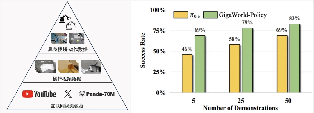 实验数据极具说服力:GigaWorld-Policy 仅用 10% 的真实机器人数据,就能达到传统 VLA 方案使用 100% 数据的效果。 这种分层范式,相比传统 VLA 实现了高达 10 倍的训练效率提升。