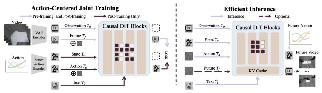基于对 “目标” 和 “现实约束” 的重新思考,GigaWorld-Policy 在架构层面做出了一个极具颠覆性的改变:让视频生成在推理时变为可选项。