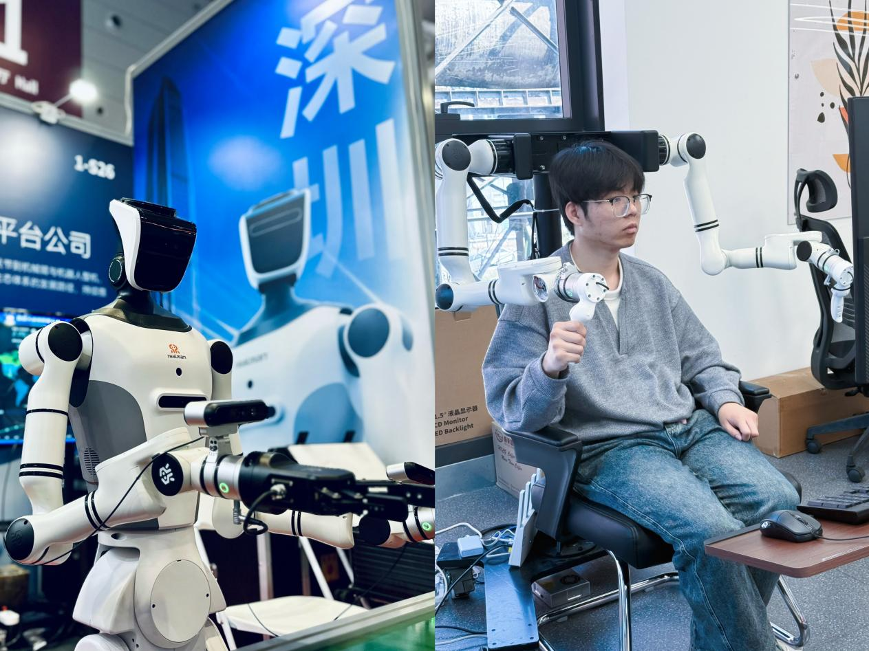 操作员坐在北京的控制台前,通过睿尔曼远程作业网络(GLN),远程操控深圳展台的RealBOT轮式人形