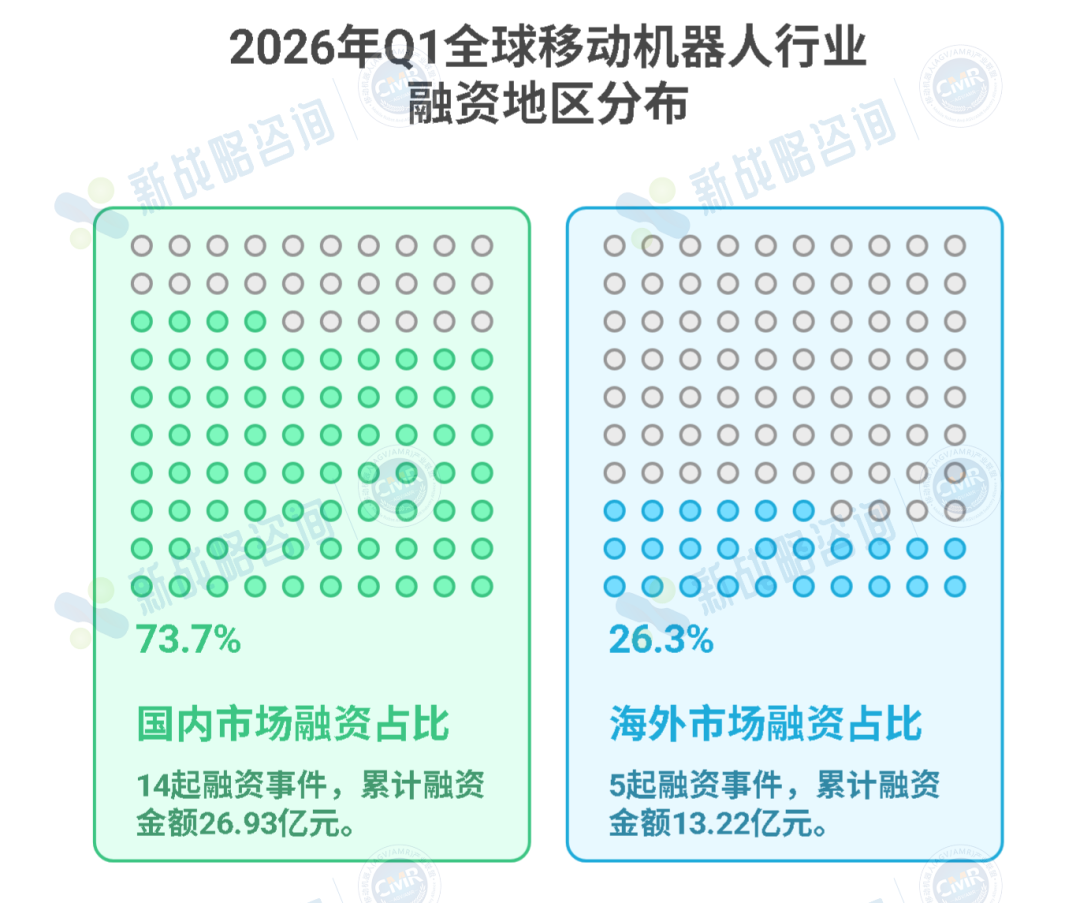 从全球融资版图来看,2026年一季度的区域结构依然清晰。国内市场共发生融资事件14起,累计金额约26.93亿元,占比约73.7%;海外市场融资事件5起,累计金额约13.22亿元,占比约26.3%。