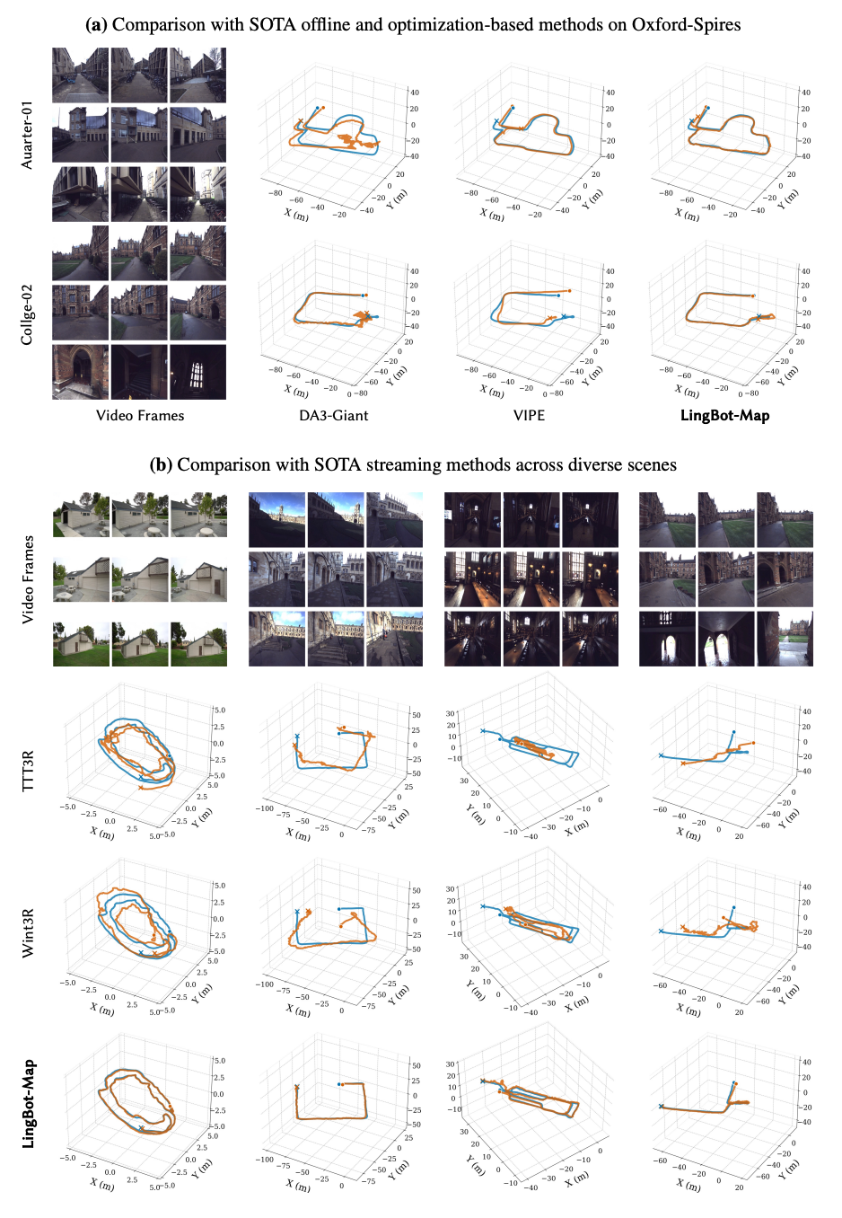 轨迹对比。(a) 在 Oxford-Spires 场景中,LingBot-Map 甚至优于双向 (DA3-Giant) 和基于优化的方法 (ViPE),能够在复杂的室内外过渡和昏暗楼梯中准确地保持轨迹。(b) 在 Tanks and Temples 以及其他 Oxford-Spires 场景中,LingBot-Map 方法始终能够生成准确的轨迹,而其他流式方法则存在严重的轨迹漂移。蓝色为真实轨迹,橙色为预测轨迹;起点为圆点 (●),终点为叉号 (×)。