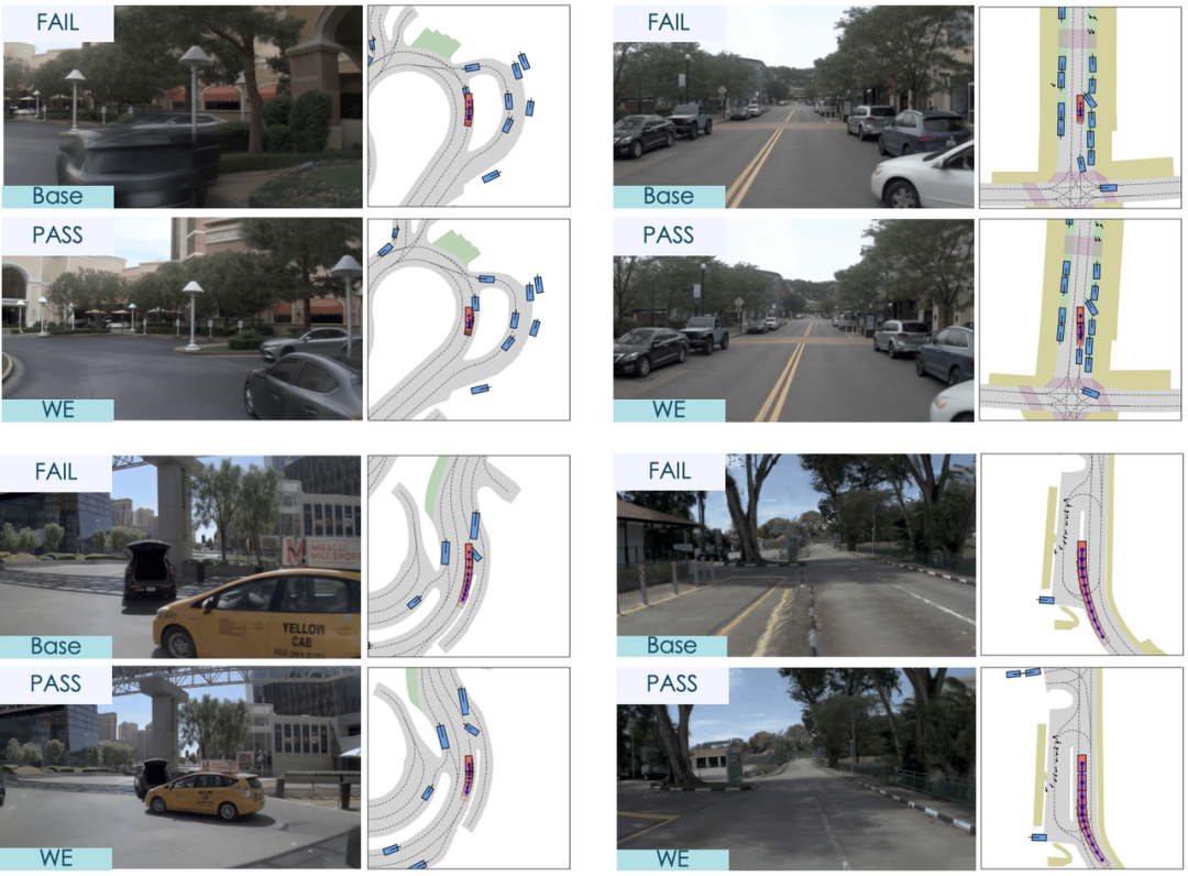 挖掘出难例之后,World Engine 并不止步于此。行为世界模型(Behaviour World Model) 以解耦扩散的方式,对这些难例场景进行变体生成 —— 在保持真实地图拓扑与场景布局的前提下,引入对抗性交通行为,批量合成高密度的安全关键场景。真实数据的长尾,由此被系统性地放大。