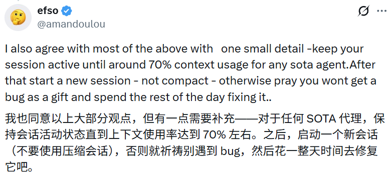 评论区里充满了真实业务场景下的血泪总结。有开发者极其犀利地指出,基于 Opus 的模型虽然跑得快,但往往会给项目积攒下大量的「代码清洁债务」,Codex 动作慢,却能在前行的同时顺手把地扫干净。我甚至看到有用户总结出了一条生存法则,建议大家在上下文窗口的使用率达到 70% 时立刻开启新会话,否则极其容易收到系统附赠的隐蔽 bug。