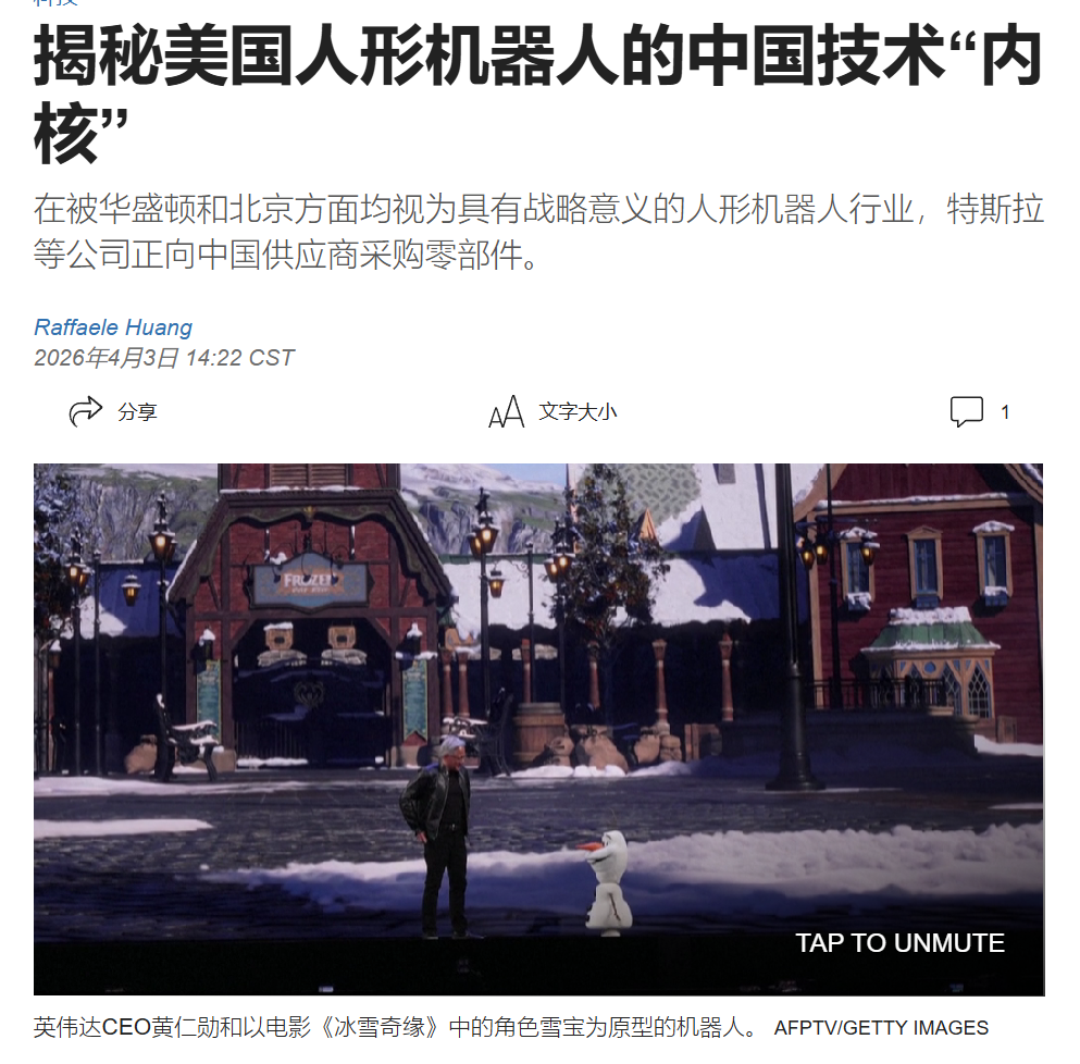 从供应链安全角度看,马斯克反复强调的“复杂供应链建立”正是核心挑战。中国供应商虽提供成本与速度优势(部分部件占Optimus成本显著比例),但Tesla始终坚持美国本土核心研发——包括AI大脑、软件架构、核心设计与知识产权——确保技术安全。生产环节置于上海,并非依赖风险,而是战略分工:利用中国生态加速全球规模化,同时通过持续本地化(如美国/欧洲备用供应链)对冲地缘不确定性。马斯克曾公开表示,正采取“巨大步骤”提升本地化程度,以降低“地缘政治不确定性带来的供应链风险”。这种“美国研发、上海生产”的模式,既继承了Tesla在EV领域的成功路径(上海工厂贡献全球近半产量),又平衡了效率与安全,最终服务于Optimus“增加地球GDP一个数量级”的宏大愿景。结合此前华尔街日报(WSJ)刊文称:没中国,美国机器人就动不了。中国和美国都将人形机器人视为战略性产业,而眼下,中国人形机器人的快速发展,让美国机器人也难以离开中国制造。据报导,今年3月,英伟达CEO黄仁勋在辉达年度GTC大会上带来了雪宝(Olaf)的机器人版本。这台机器人汇集了美国三家最知名的公司,由迪士尼提供角色,辉达和谷歌提供人工智能技术。根据迪士尼公司的一篇论文,如果没有中国机器人制造商宇树科技提供的零部件来驱动其颈部和腿部的运动,雪宝就无法行走或摆动身体。得益于中国极其强大的供应链,据知情人士透露,特斯拉正在中国组建一个团队,将与其Optimus人形机器人的供应商合作。据悉,特斯拉的员工已经拜访了中国的传感器、电机和其他零部件制造商。此举是为Optimus的量产做准备。马斯克曾在去年11月预测,Optimus将成为有史以来影响力远超其他的产品。另外,从降本角度,摩根士丹利估计,中国供应链可将人形机器人的制造成本降低多达三分之二。上海工厂是Tesla Optimus的必然选择。美国本土研发守护技术根基与战略安全,上海工厂则以其制造基因和供应链生态提供规模化“金钥匙”。