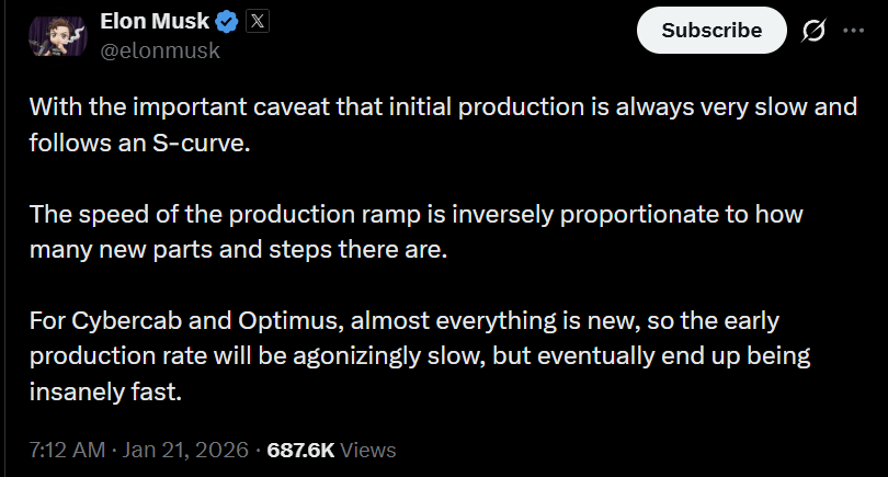 2024年11月,马斯克在X上明确指出,Optimus已在工厂执行部分实际任务,但“最困难的部分远超想象,是改进Optimus的设计以便于制造,并建立复杂的供应链,以便实现大规模生产”。这一观点奠定了后续进展的主基调,强调供应链与制造可行性是量产的最大障碍,而非技术本身。2025年5月,马斯克进一步透露,Tesla正在建设月产1000台Optimus的生产线,但“仍需数月准备”。同年11月,他再次强调,Optimus达到量产规模将带来比无人驾驶更大的估值跃升进入2026年,进展加速。1月,Tesla完成Optimus Gen-3量产审核,确定7家中国核心供应商(包括蓝思科技、三花智控、拓普集团等)作为Tier-1伙伴,支持关键部件制造与组装,计划Q1启动量产,年底目标产能5-10万台。同时,马斯克宣布Fremont工厂将逐步停产Model S/X,转为Optimus生产线,Giga Texas则负责更高体积生产。1月20日,他重申初期生产“总是非常缓慢,呈S曲线”,因为“Cybercab和Optimus几乎一切都是新的”,但最终 ramp-up 将“极其迅猛”。2026年3月,马斯克再次确认Fremont Optimus工厂“几个月内”投产。4月14日,王浩在上海工厂媒体行中表示:“像其他Tesla工厂一样,上海超级工厂也能承担包括机器人等所有新产品制造的重要责任。”他直言上海工厂是解决马斯克此前指出的量产挑战的“金钥匙”,分析师据此推测年底产能或达10万台/年。X平台上有推文明确总结:“Optimus = 美国加州 + 中国上海”,凸显研发与生产的分工格局。此外,马斯克本人多次在X上阐述供应链观点:他强调生产体积需超过100万台/年才能将单价压至约2万美元,“价格最终由需求驱动,但供应链是关键”。2025-2026年间,他还提到Optimus生产曾受中国稀土磁铁出口限制影响,Tesla正通过本地化努力降低地缘供应链风险,但“最慢的组件决定整体速度”。上海工厂成为Optimus“必然选择”的逻辑清晰且务实。