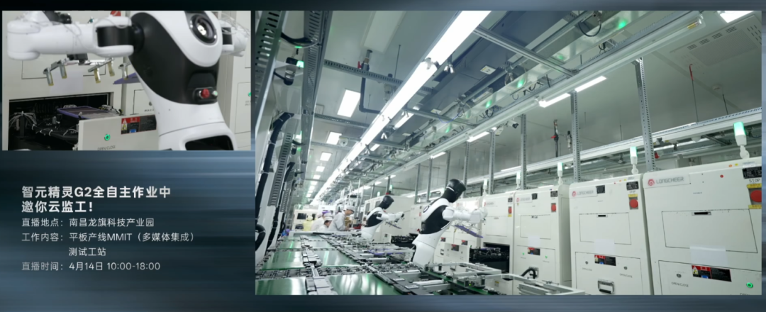 其中两台具身作业机器人智元精灵 G2 以产线正式员工身份,在高速流水线上负责精密上下料的任务。它们在产线一侧抓取平板电脑,将其放入测试设备,待测试完成后再取出并放至另一条流水线。