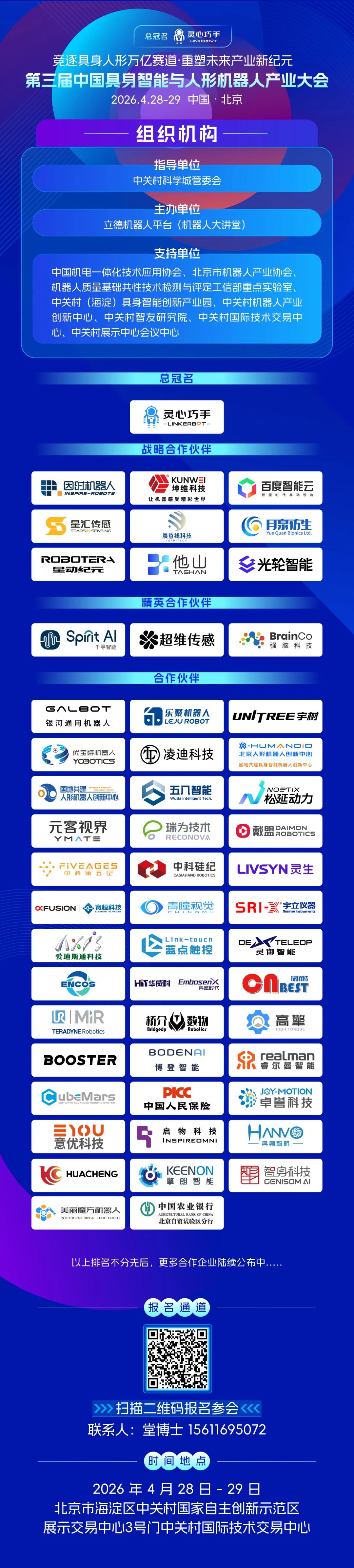 第三届中国具身智能与人形机器人产业大会由立德机器人平台(机器人大讲堂)发起,将于2026年4月28日-29日在北京市海淀区中关村国家自主创新示范区展示交易中心3号门中关村国际技术交易中心举办!大会以“竞逐具身人形万亿赛道·重塑未来产业新纪元”为主题,搭建涵盖政、产、学、研、投、用的高端对话平台。全面梳理技术创新脉络、研判产业发展趋势、推动场景落地与供需对接,加速国产化替代与规模化应用,助力中国在全球具身智能与人形机器人产业竞争中抢占先机,携手共建开放协作产业生态。