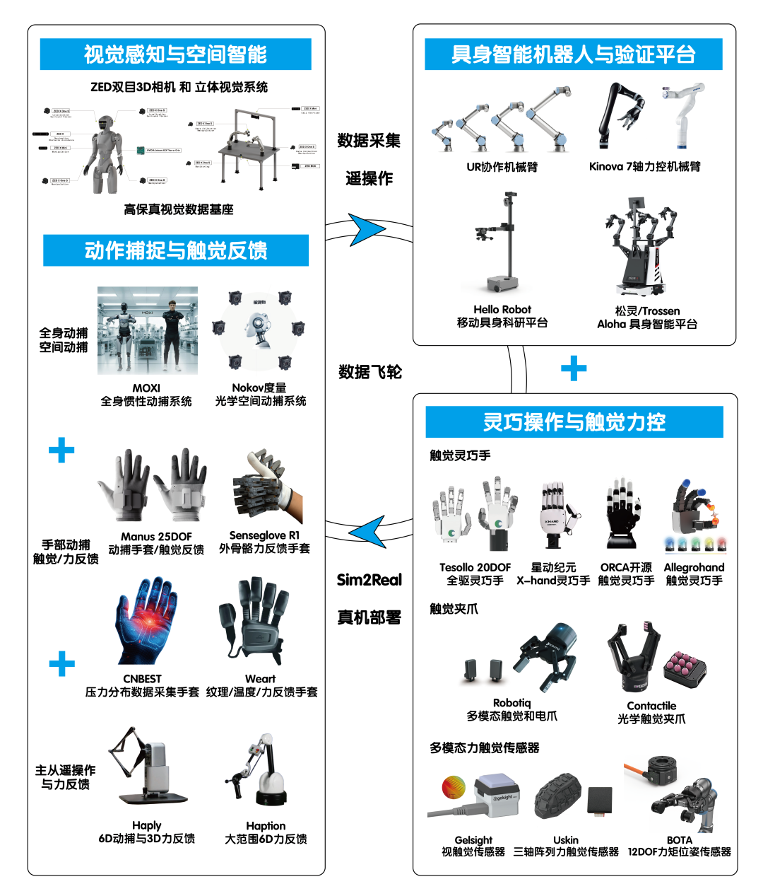 凭借在机器人与传感器领域十余年的深厚积累,公司整合全球上百种前沿硬件资源,构建了覆盖“视觉感知、动作示教、触觉力控、意图认知、灵巧操作”五大模态的模块化数据采集平台。