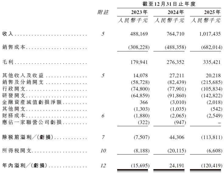 财报数据则呈现出菲亚兰德的成长态势与发展挑战。2023年至2025年,该公司营业收入实现稳步增长,分别达到人民币4.88亿元、7.65亿元和10.17亿元,三年间营收规模实现翻倍以上增长;但净利润呈现明显波动,分别为人民币-1569.5万元、2419.1万元和-12041.9万元,经调整净利润分别为人民币2741.8万元、5077.0万元和-10690.1万元。