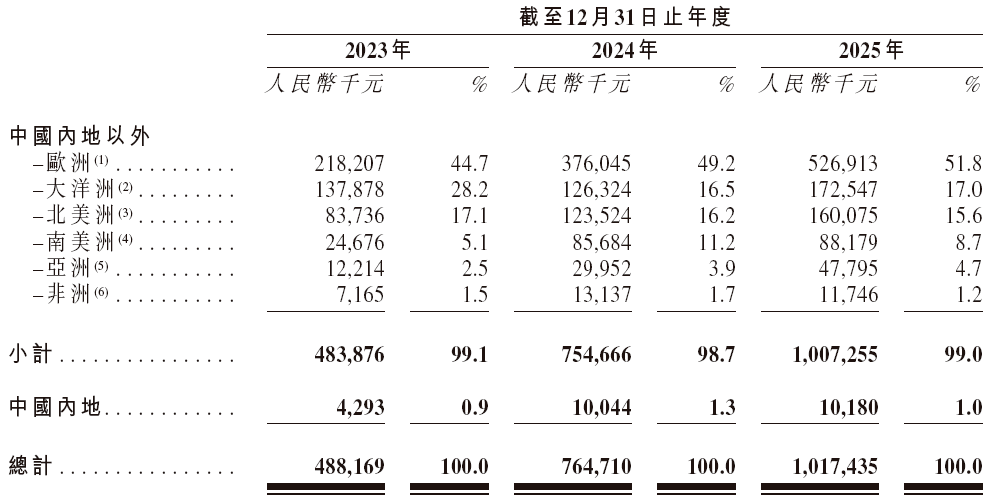 从市场来看,菲亚兰德收入高度依赖海外市场。2023-2025 年,菲亚兰德来自海外市场的收入占比始终保持在 98.7% 以上,其中欧洲为第一大市场,收入规模由 2023 年的 2.18 亿元增长至 2025 年的 5.27 亿元,占比由 44.7% 提升至 51.8%,贡献过半营收。相比之下,中国内地市场收入规模较小,占比仅在 1% 左右波动。整体来看,菲亚兰德在海外市场的深耕之路成效显著,核心市场的壁垒日益稳固。但与此同时,地缘政治的风云变幻、贸易政策的调整迭代以及汇率波动的潜在影响,亦为其海外布局埋下了些许不确定性。