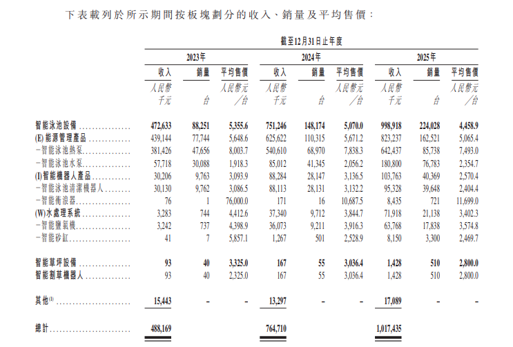 分业务板块来看,智能机器人板块于2023年至2025年,收入从3020.6万元增长至1.04亿元,占总营收的比例从6.2%提升至10.2%。其中,智能泳池清洁机器人作为核心细分,收入从2023年的3013.0万元增至2025年的9532.8万元,成为拉动机器人板块增长的核心动力。