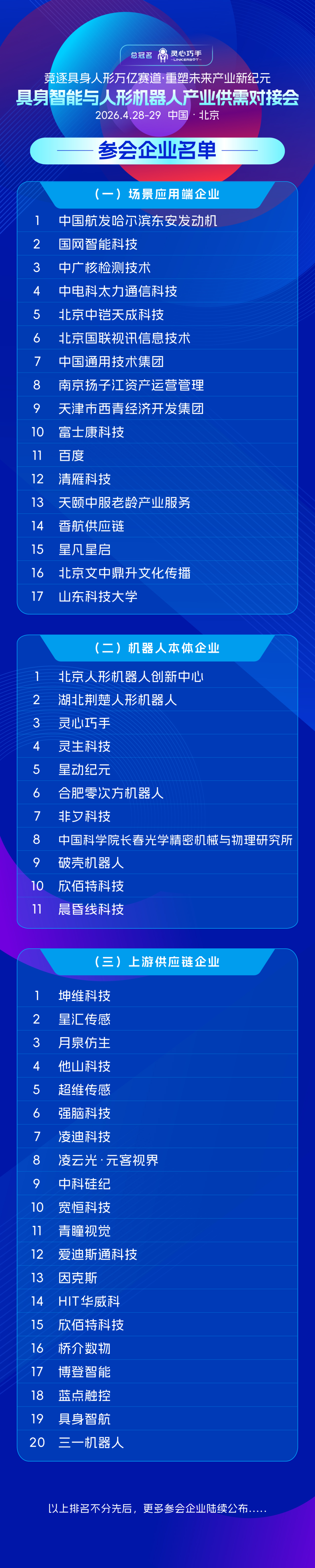 跨维智能 | 银河通用 | 千寻智能 | 灵心巧手 | 睿尔曼智能 | 微亿智造 | 推行科技 | 中科硅纪 | 枢途科技 | 灵巧智能 | 星尘智能 | 穹彻智能 | 方舟无限 | 科大讯飞 | 北京人形机器人创新中心| 国地共建人形机器人创新中心 | 戴盟机器人| 视比特机器人| 星海图 | 月泉仿生 | 零次方机器人 | 中科深谷 | 智平方 | 大咖机器人 | 灏存科技| 具识智能 | Xynova曦诺未来 | 非夕科技 |未来动力 | 博登智能 | 千诀科技 | 灵生科技 | 集萃智造 | 欣佰特科技 | 晨昏线科技 | Dexmal 原力灵机 | 优理奇