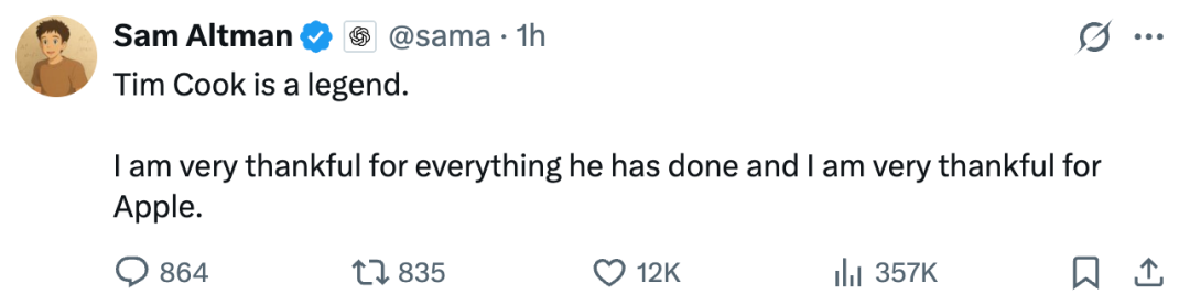 OpenAI CEO 奥特曼对库克的离任表达了敬意,「库克真的是个传奇。我很感激他做过的所有事情,也很感谢苹果这家公司。」