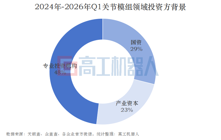 这笔”经济账”让资本也开始变得狂热。高工机器人观察到,有上百家投资机构参与了关节模组行业的赛马竞逐,其中产业资本占据23%,国资投手占比近30%,剩下近一半则是专业投资机构。