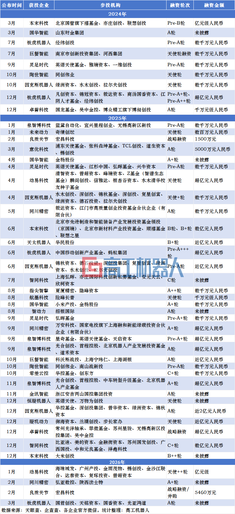专业投资机构中不乏红杉中国、经纬创投等顶尖PE/VC机构,陪伴周期覆盖了从早期天使轮到中后期C轮、D轮,是关节模组产业链的投资主力。