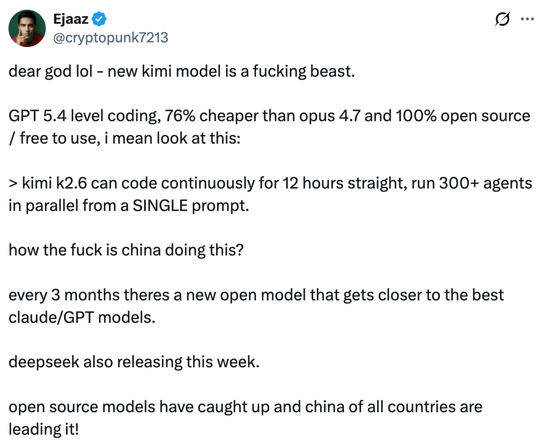 有网友感叹,这代 Kimi 旗舰模型强到离谱,写代码这块已经可以跟 GPT-5.4 掰手腕了,价格又比 Opus 4.7 低一大截,还是开源、免费用。现在基本每隔几个月,都会有一个新的开源模型逼近闭源 GPT 和 Claude。「感觉开源模型真的追上来了,而且都是中国在推进节奏。」