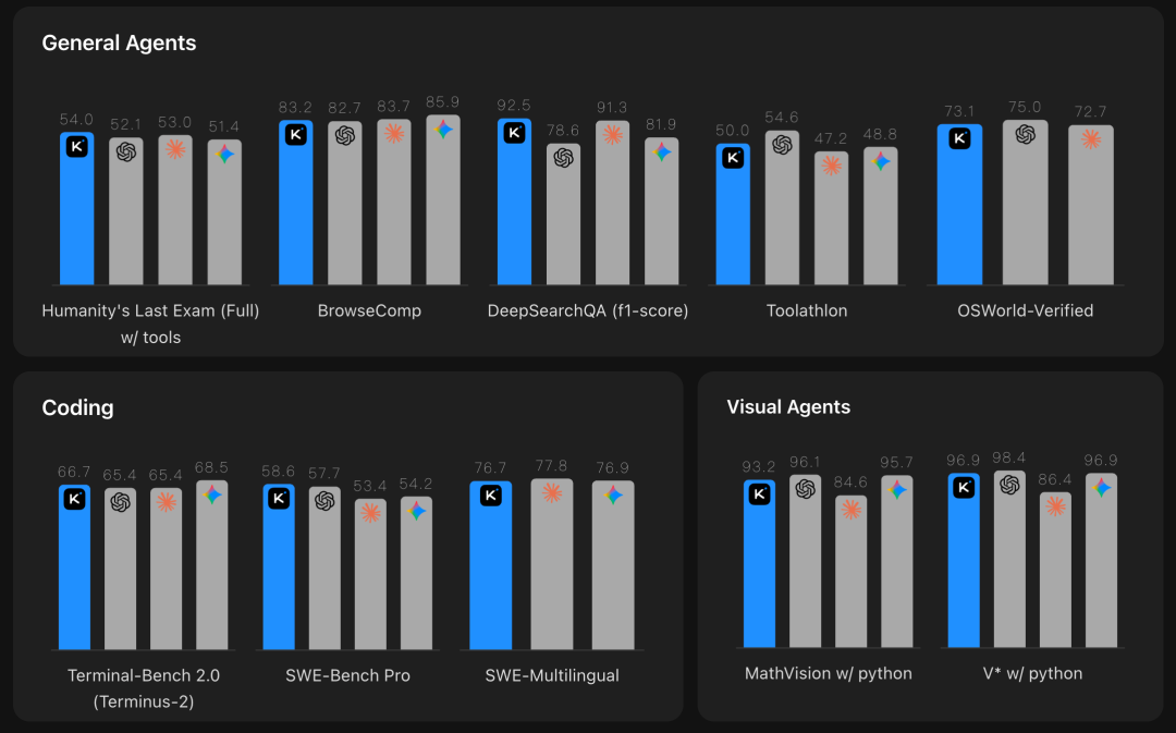 即使将 K2.6 与 GPT-5.4、Claude Opus 4.6、Gemini 3.1 Pro 这些闭源模型放在一起看,它也完全不虚,甚至有些指标还能压一头。