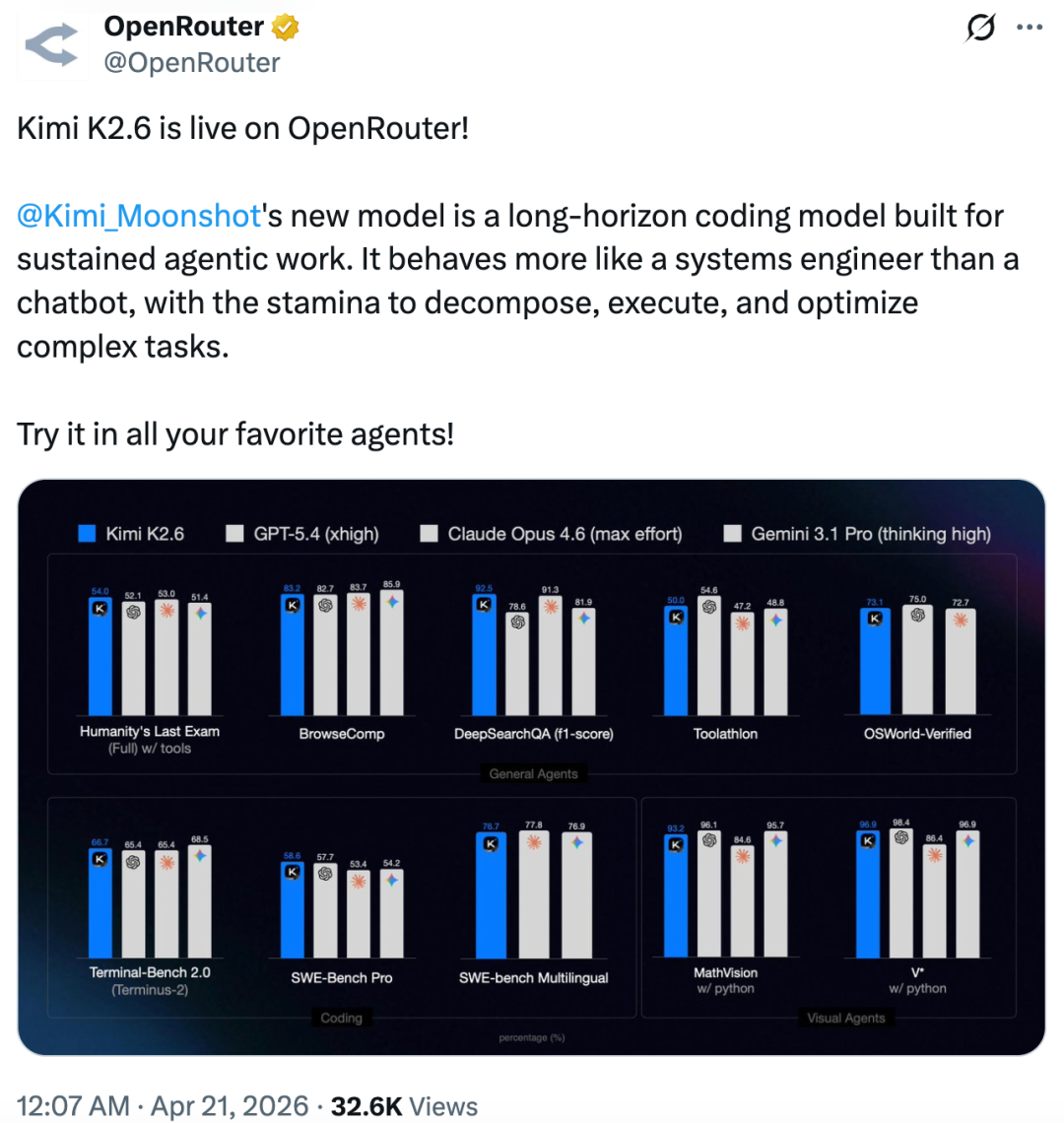 在上线 Kimi K2.6 之后,大模型聚合平台 OpenRouter 给出了颇高评价,认为月之暗面新一代模型主打长时序编程能力,专为需要持续执行的 Agent 场景打造。相比传统聊天机器人,它更像一个「系统工程师」,能把复杂任务拆解开来,一步步执行,并在过程中不断优化。