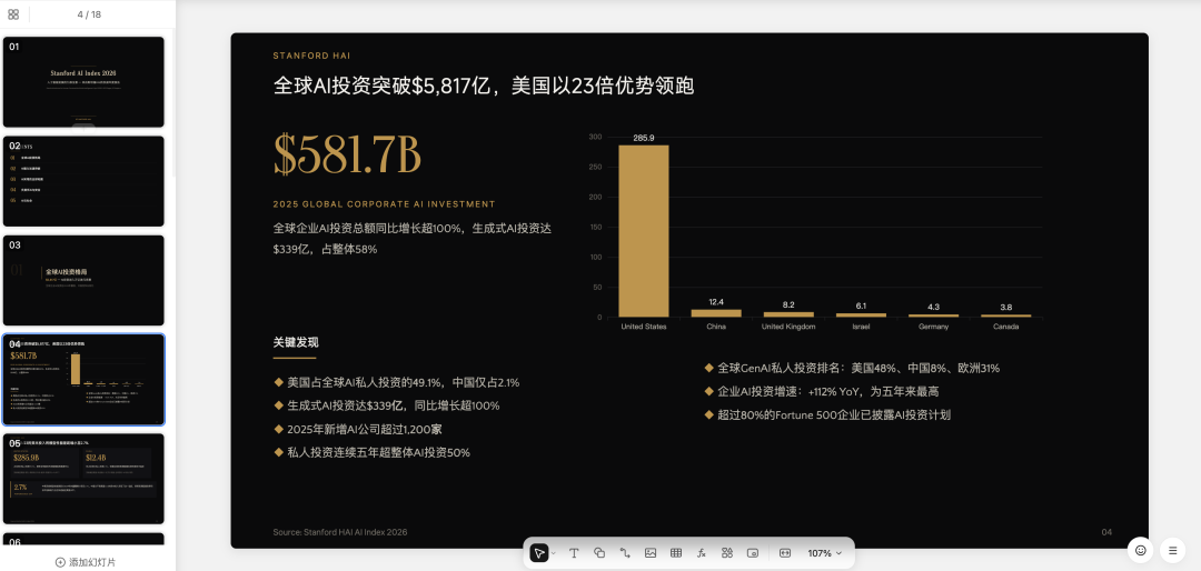 我们接着实测了 K2.6 Agent 集群的功能,为斯坦福大学《2026 年人工智能指数报告》制作了宣传册,要求其交付网页、表格和 PPT,并且完全没有给予任何附加信息和文档,考验智能体集群相互写作的性能。