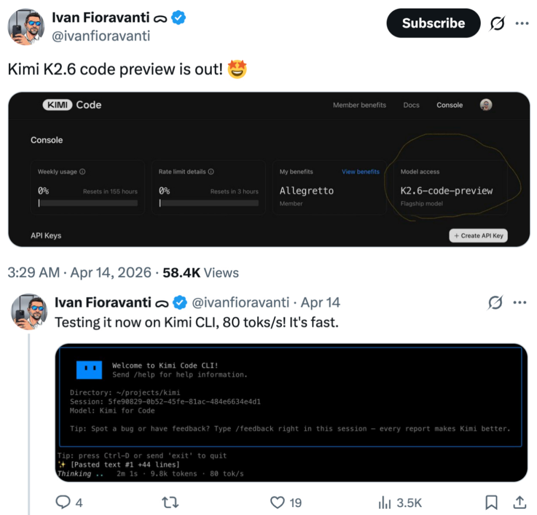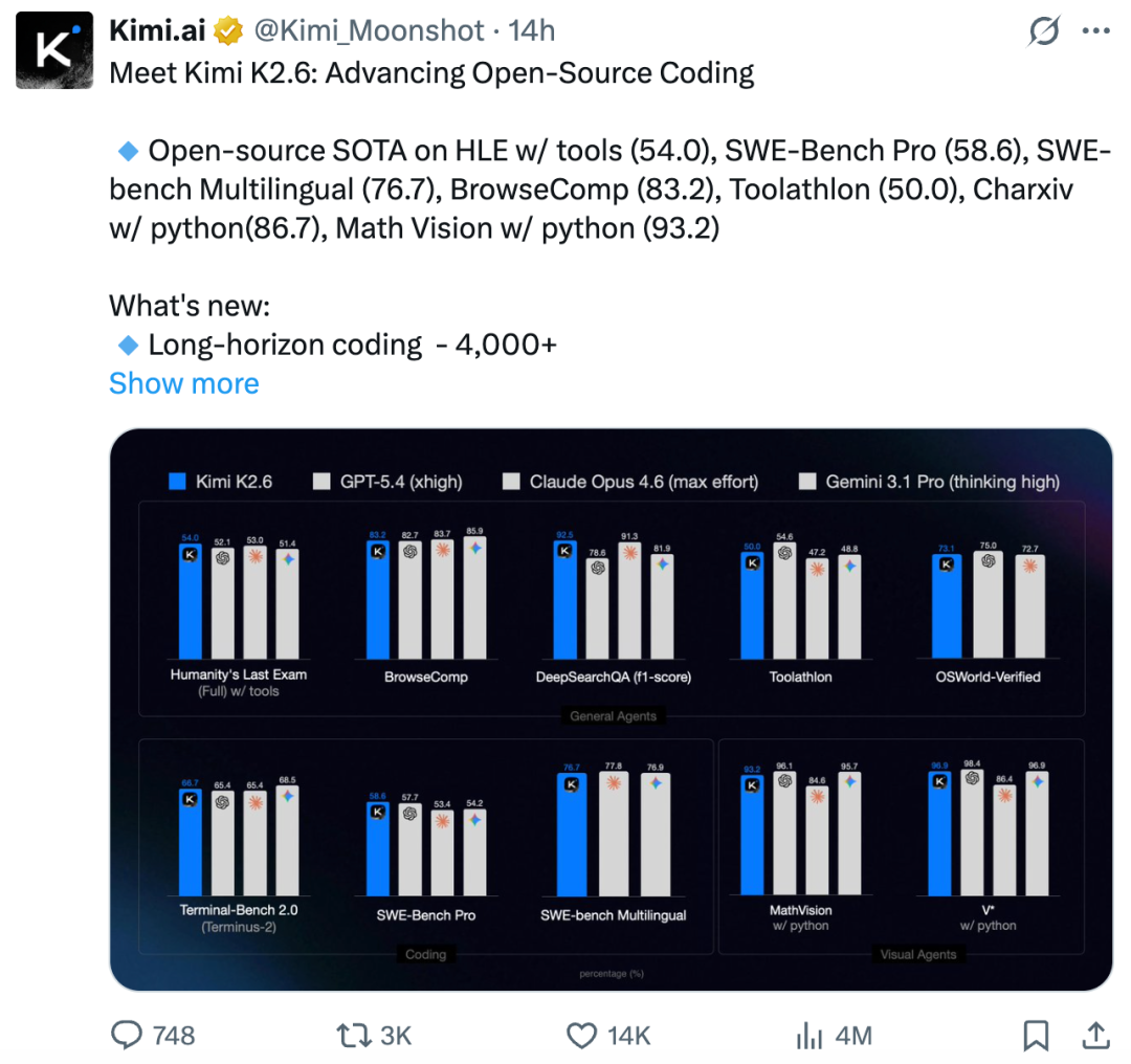 就在今天凌晨,月之暗面正式发布并开源了 Kimi 系列最新一代旗舰模型 ——Kimi K2.6,距离上个版本 K2.5 推出还不到 3 个月的时间。发出来之后热度非常高,官推浏览量已经达到 400 万。
