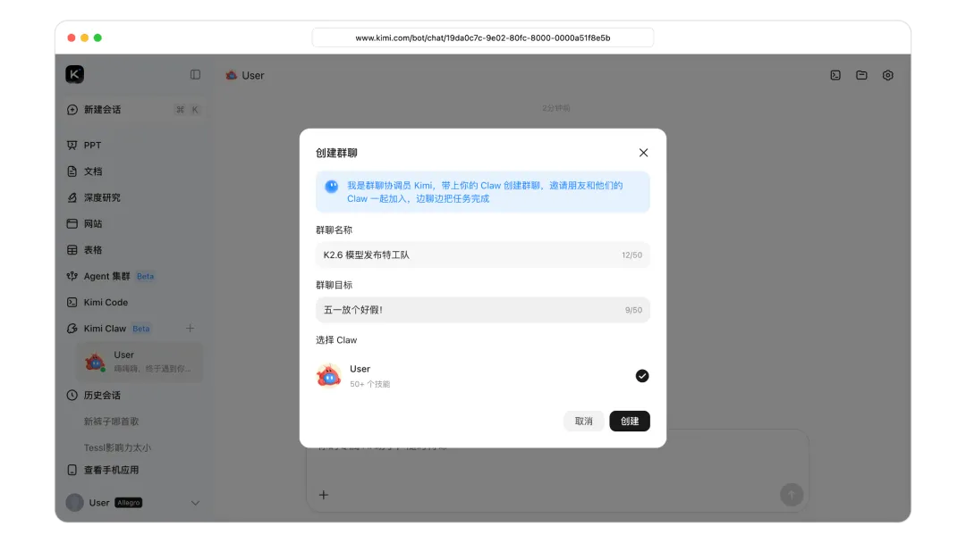新版本探索了如何激发 Agent 的团队协作能力:进一步加强 K2.5 引入的 Agent Swarm(Agent 集群)功能,通过对 OpenClaw 等框架的适配强化 Agent 主动式工作,全新的 Claw Group(Claw 群组)又补上了组织协作这一能力。这一整套能力的系统性叠加,构建起了一个更接近人类团队的 AI 系统。