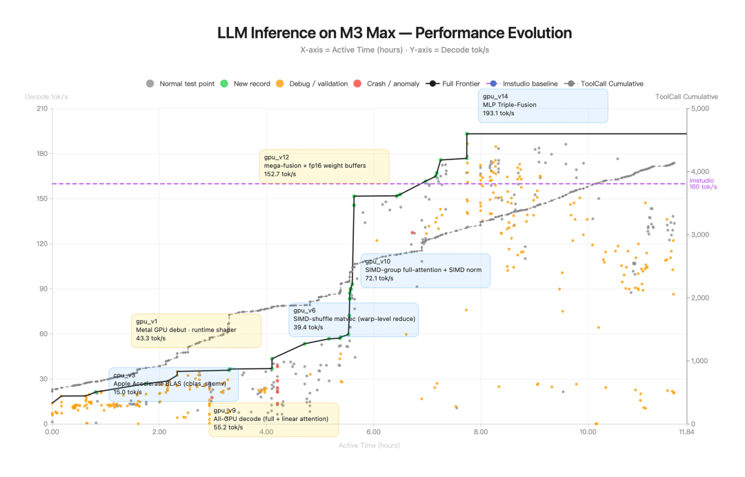 整个过程持续了 12 个多小时,期间调用工具超过 4000 次,前后迭代 14 轮。随着不断调参和重构,推理速度从最初的约 15 tokens/s 一路跃升到约 193 tokens/s,最终比本地大模型聊天应用 LM Studio 还快了大约 20%。