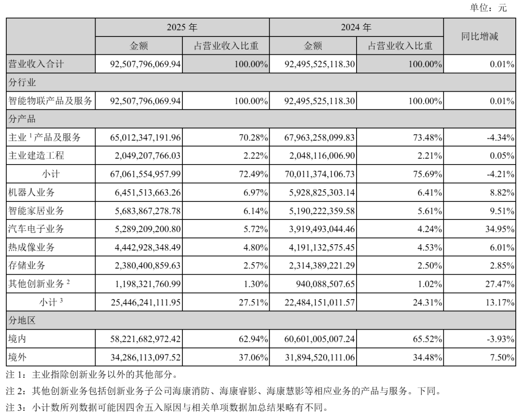 作为创新业务中的核心力量,2025年海康机器人实现营收64.52亿元,同比增长8.82%,营收占比提升至6.97%。