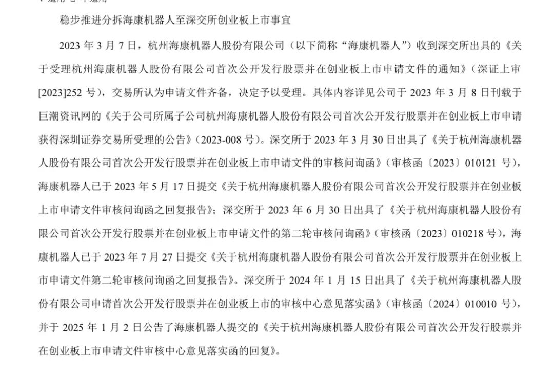 值得关注的是,海康机器人的IPO进程一直备受市场瞩目。2025年报显示,海康机器人上市事宜正稳步推进。据悉,2023年3月,海康机器人创业板IPO申请获深交所受理。此后,深交所先后于2023年3月、6月出具首轮及第二轮审核问询函,该公司均按期完成回复。2024年1月15日,该公司收到深交所审核中心意见落实函,相关回复内容于2025年1月2日对外公告,IPO进程有序推进。