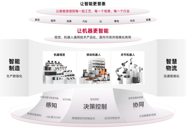 经过十年的算法积累与软硬件开发,海康机器人背靠海康威视的强大资源支撑,以多维感知、人工智能、导航控制和决策规划等核心技术为基石,聚焦工业物联网、智慧物流和智能制造领域,以“智慧融合,眼脚手协同”为核心战略,全面推动 AI 与感知、决策、执行系统的深度融合,持续在机器视觉(眼)、移动机器人(脚)、关节机器人(手)等核心业务方向深耕开拓。