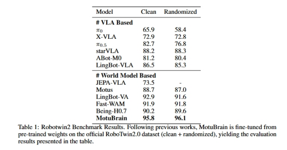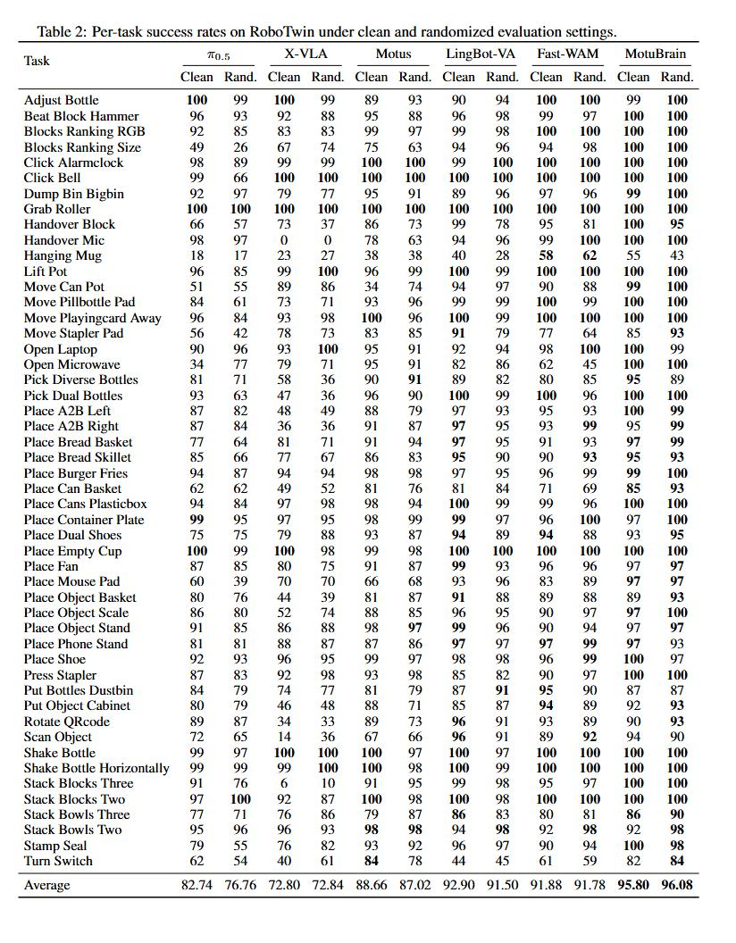 而在更偏任务执行的 RoboTwin 上,这种优势被进一步放大。面对 50 个任务、两种不同环境设置,MotuBrain 的平均得分达到 96.0,显著高于第二名的 92.3,领先幅度几乎等同于第二名到第五名之间的差距。